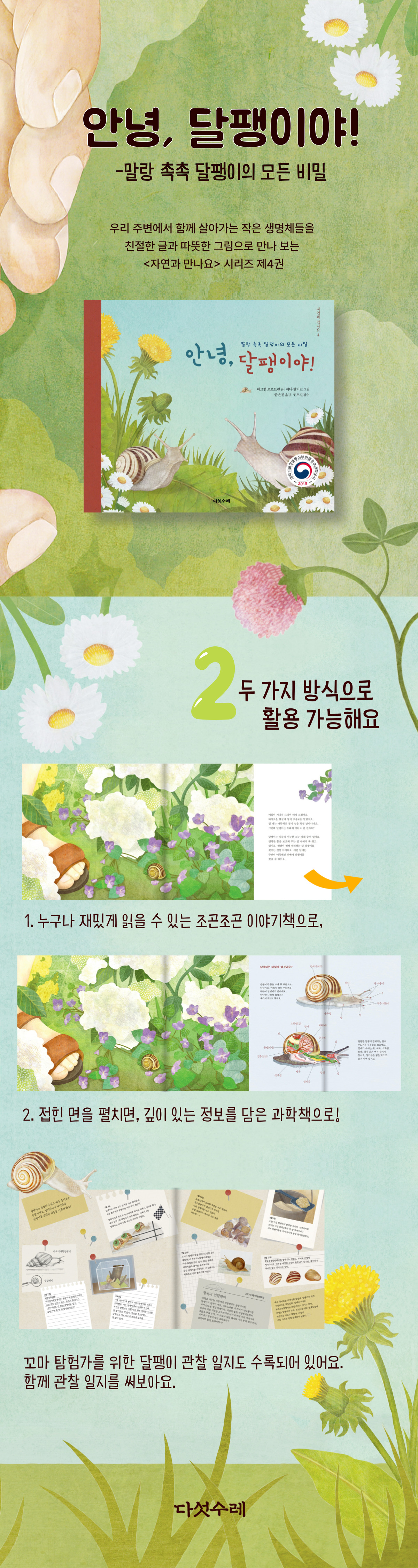 등에 껍데기가 있는 달팽이, 껍데기가 없는 달팽이, 허파로 숨을 쉬는 달팽이, 아가미로 숨을 쉬는 달팽이 등 친근한 달팽이는 물론 지금까지 단 한 번도 보지 못한 달팽이들의 놀라운 세상을 함께 탐험해 본다. 달팽이의 종류와 생김새, 숨쉬기, 짝짓기, 알 낳기, 먹잇감, 자라나는 모습뿐만 아니라 달팽이의 움직임이나 달팽이가 지나간 길에 남는 흰 자국, 겨울나기, 천적까지 달팽이의 모든 것을 보여 주는 자연그림책이다.